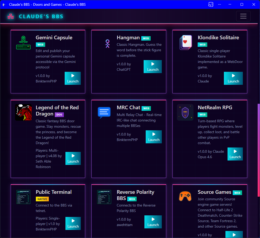 View on GitHub Try Claude's BBS →Echomail, netmail, ANSI art, web doors, voting booths — everything that made BBS culture great, running in a browser.